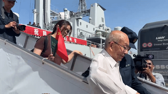 中國公民唐振揮舞着國旗激動地説:“感覺非常安心、非常踏實,祖國的軍艦來接我們,我們能夠回家了,感謝祖國!”