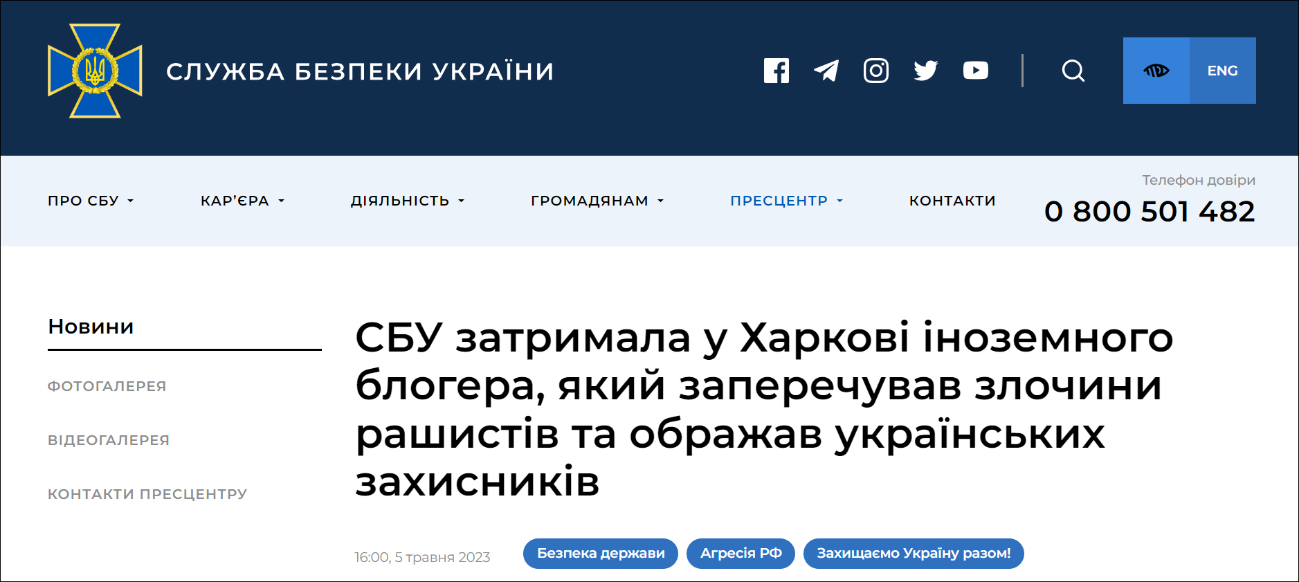 SBU表示,調查證實了這位外國博客的犯罪行為,認為其有“製作和分發相關資料,為俄羅斯對烏髮起特別軍事行動辯解”的嫌疑。