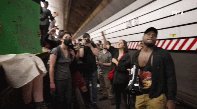 抗議活動迫使一輛進站的Q線列車在入站處緊急制動。視頻中可以聽到當地警察試圖維持秩序。