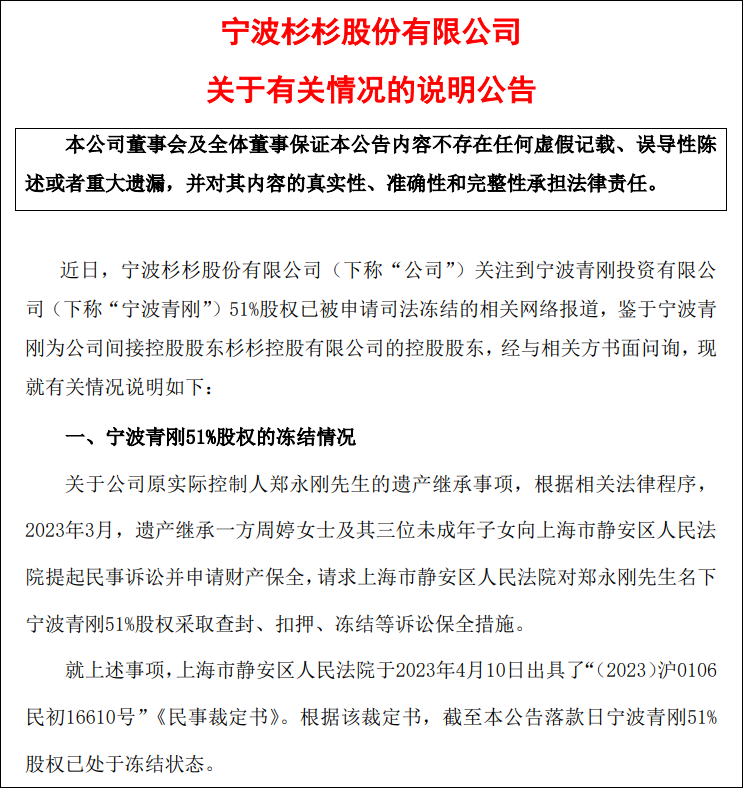 5月8日晚間,就在大家都以為這場豪門之戰即將平息,鄭永剛遺孀周婷正式進入董事會的前夕,杉杉股份發佈公告證實,其間接控股股東的控股股東寧波青剛投資有限公司(下稱“青剛投資”)的51%股權被凍結。