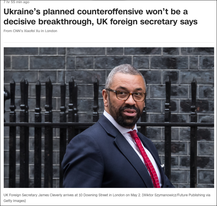 英國外交大臣克萊弗利5月9日表示,儘管烏克蘭表現出了巨大的勇氣和抵抗力,但反攻可能不會取得“決定性突破”,人們不應該期待基輔會上演“好萊塢電影般”的劇情。他還稱,英國歡迎中國在結束衝突方面發揮更具建設性的作用。