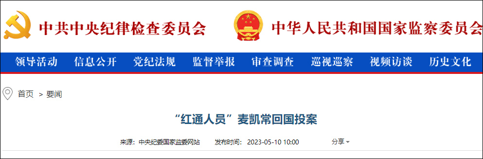 據中央紀委國家監委網站5月10日消息,近日,在廣東省追逃辦統籌協調下,經清遠市、清城區紀檢監察機關不懈努力,外逃7年的“紅通人員”、行賄犯罪嫌疑人麥凱常回國投案。