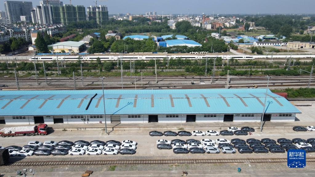 這是位於合肥市長豐縣的鐵路水家湖貨運站等待裝車外運的新能源汽車(5月9日,無人機照片)。新華社記者 劉軍喜 攝