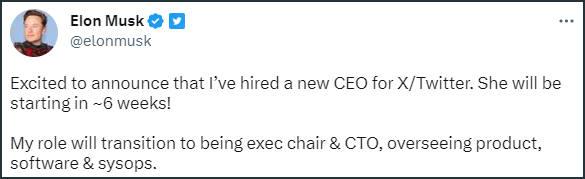 馬斯克表示,新的推特CEO將於6個星期後上任。他尚未透露這將是何人,但推文用“她”代指此人。據此,“彭博社”猜測,新的推特CEO可能是:推特信任和安全主管埃拉·歐文(Ella Irwin)、特斯拉董事會主席羅賓·丹霍爾姆(Robyn Denholm)、SpaceX總裁兼首席運營官格温·肖特威爾(Gwynne Shotwell)、或近日與馬斯克多次往來的“NBC環球”全球廣告與合作伙伴關係主管琳達·雅卡里諾(Linda Yaccarino)。