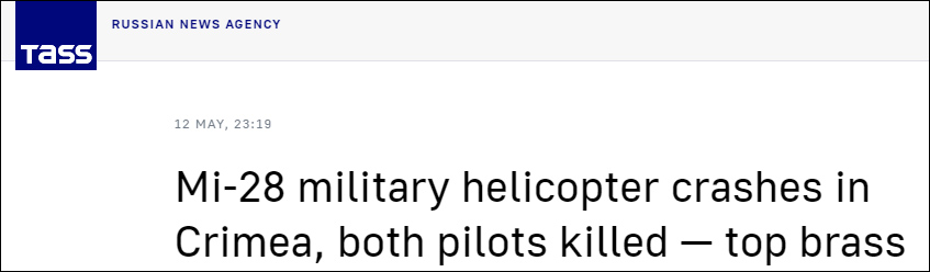 (觀察者網訊)據俄羅斯塔斯社援引俄國防部消息,當地時間5月12日下午3點42分,俄軍一架米-28武裝直升機在克里米亞地區進行飛行訓練時墜毀,兩名飛行員確認遇難。