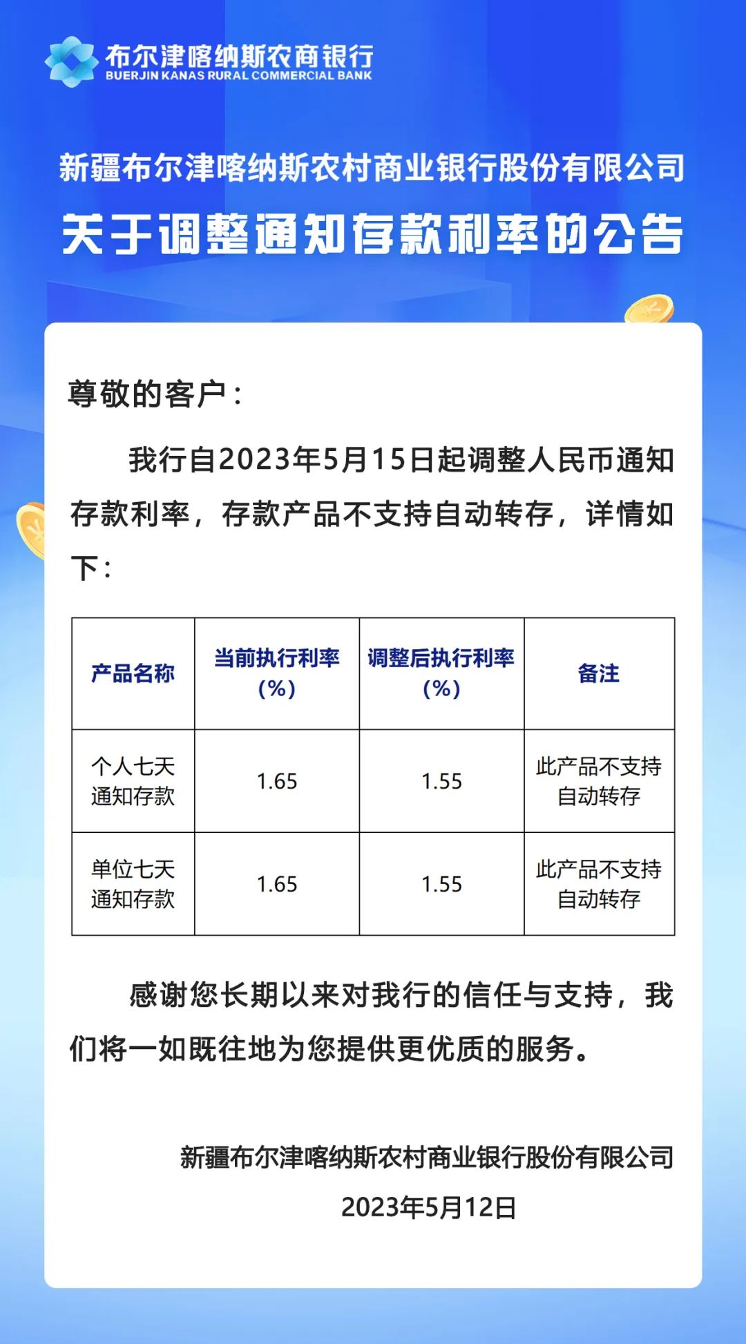新疆布爾津喀納斯農商銀行將於2023年5月15日起調整人民幣通知存款利率,個人七天通知存款、單位七天通知存款調整後執行利率為1.55%。
