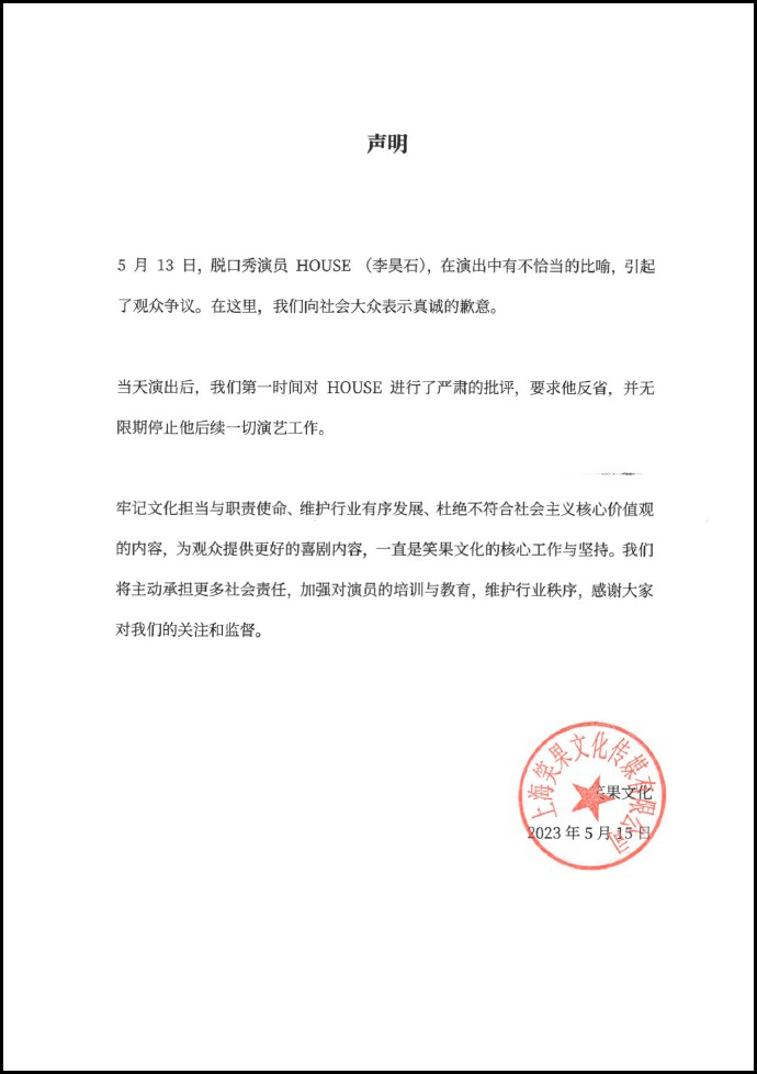 5月15日,上海笑果文化傳媒有限公司官方微博發佈聲明稱,5月13日,脱口秀演員HOUSE(李昊石),在演出中有不恰當的比喻,引起了觀眾爭議。該公司向社會大眾表示真誠的歉意。笑果文化表示,將無限期停止HOUSE後續一切演藝工作。