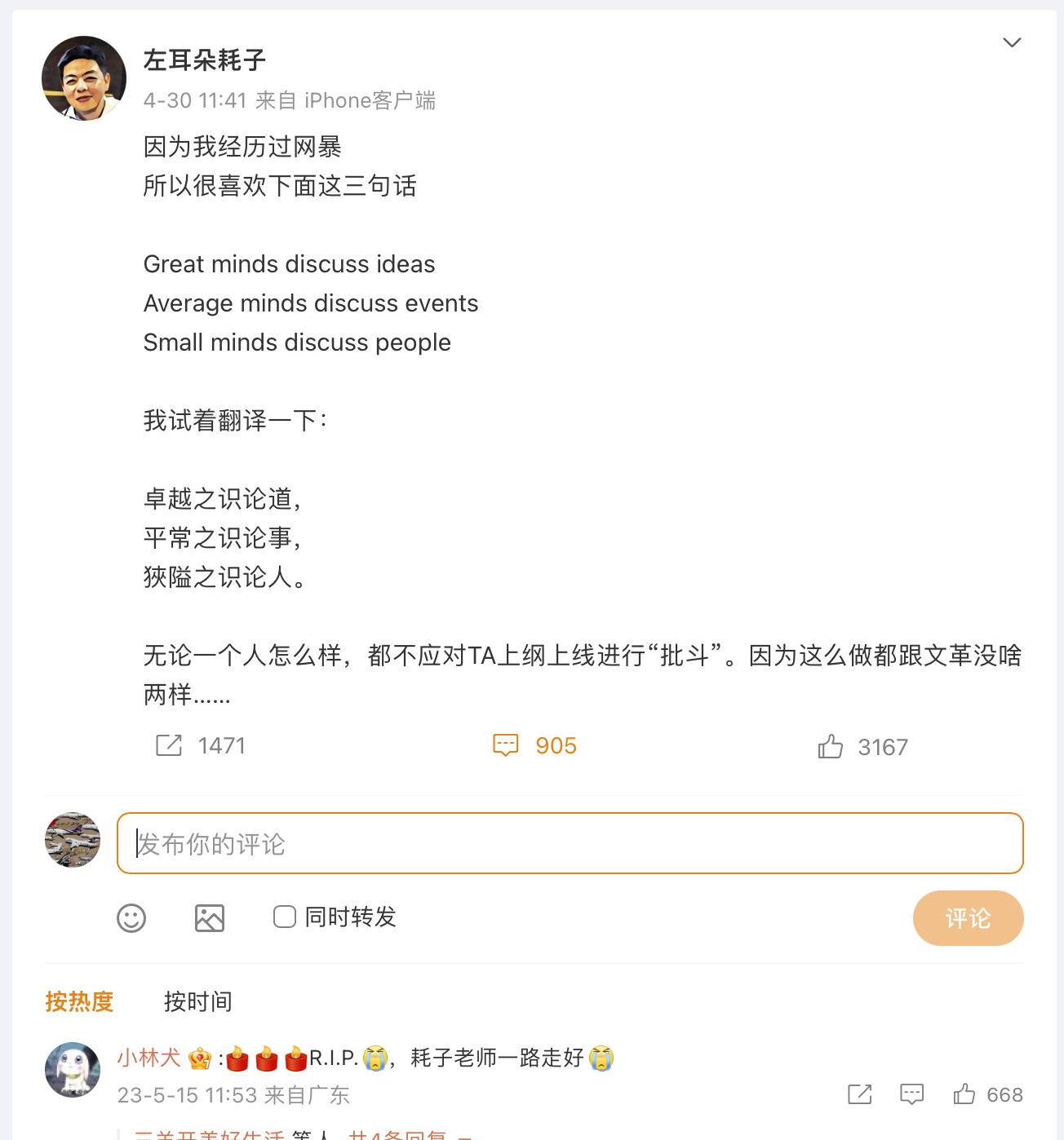 與此同時,陳皓在網絡上也非常活躍,經常更新自己的技術思考和想法。比起原名陳皓,他的網名“左耳朵耗子”更為人熟知,還有不少後輩程序員親切地稱呼他為“耗子叔”。由於陳皓在廣大程序員羣體中擁有廣泛的知名度,因此他去世的消息一度登上了微博熱搜,大家紛紛表達對他的悼念。