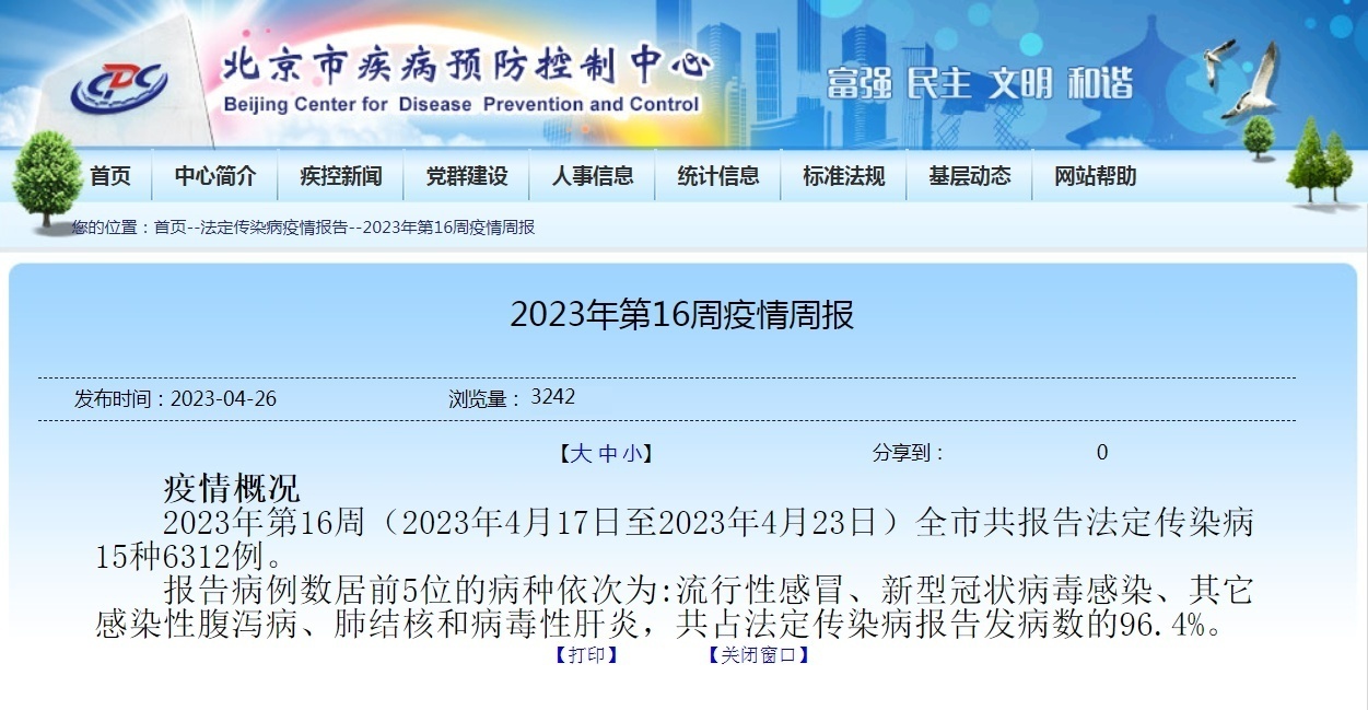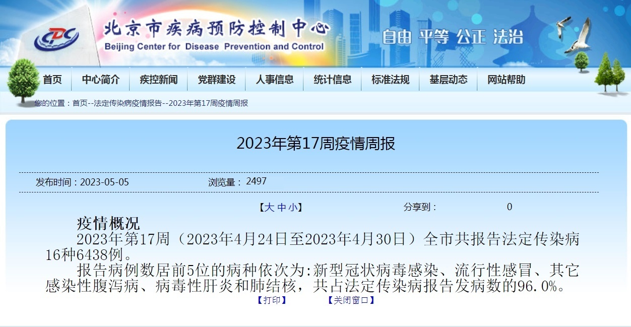 北京市疾病預防控制中心發佈的疫情週報顯示,2023年第17周(4月24日-30日)以來,新冠感染連續兩週超越流感,重返法定傳染病病種排名第一。