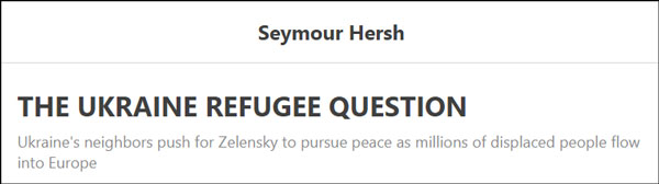 知名調查記者赫什一直在跟進俄烏衝突的相關報道。5月17日,赫什在其網站發佈題為“烏克蘭難民問題”的文章,稱在數百萬無家可歸者湧入歐洲之際,以波蘭為首的烏克蘭鄰國正在私下敦促澤連斯基尋求和平。