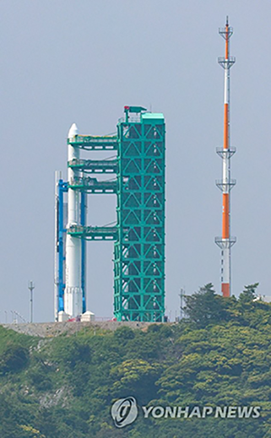 5月23日,在全羅南道高興郡羅老宇航中心,韓國自主研製的運載火箭“世界”號完成起豎並被固定在發射台上 圖自韓聯社