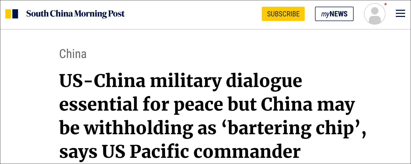 (觀察者網訊)據香港《南華早報》24日報道,當地時間週二(23日),美軍印度洋-太平洋司令部司令約翰∙阿奎利諾(John C. Aquilino)在美中關係全國委員會(NCUSCR)組織的一次活動上表示,美中軍事對話對地區和平至關重要,他多次請求與中方交談卻未得到回應。