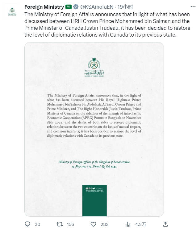 根據加方和沙方發佈的聲明,兩國恢復外交關係的決定是加拿大總理特魯多和沙特王儲兼首相穆罕默德去年11月在曼谷的APEC峯會期間進行討論並作出的。