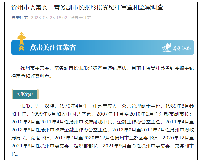 微信公眾號“清廉江蘇”5月25日消息,徐州市委常委、常務副市長張彤涉嫌嚴重違紀違法,目前正接受江蘇省紀委監委紀律審查和監察調查。