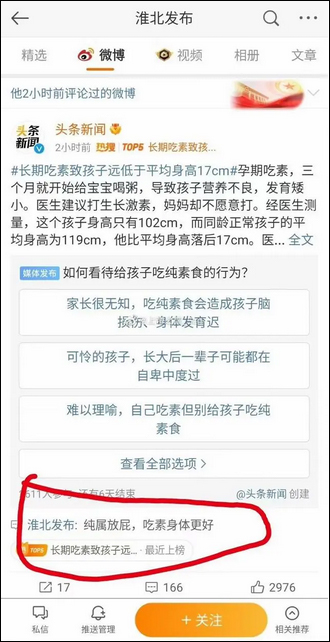 據上游皖觀察此前報道,在“如何看待吃純素食行為”話題投票內,@淮北發佈 曾留言發表不當內容。