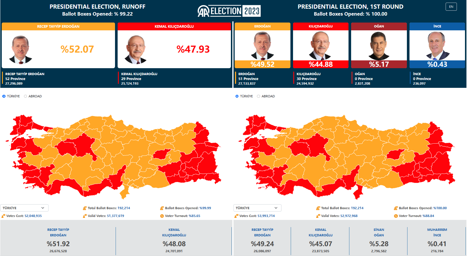當地時間5月28日,土耳其阿納多盧通訊社公佈的第二輪投票初步統計結果顯示,截至目前,99.22%選票已統計完畢,現任總統埃爾多安獲得52.07%的有效選票,獲得連任;反對派“民族聯盟”的候選人凱末爾·克勒奇達爾奧盧獲得47.93%的有效選票。