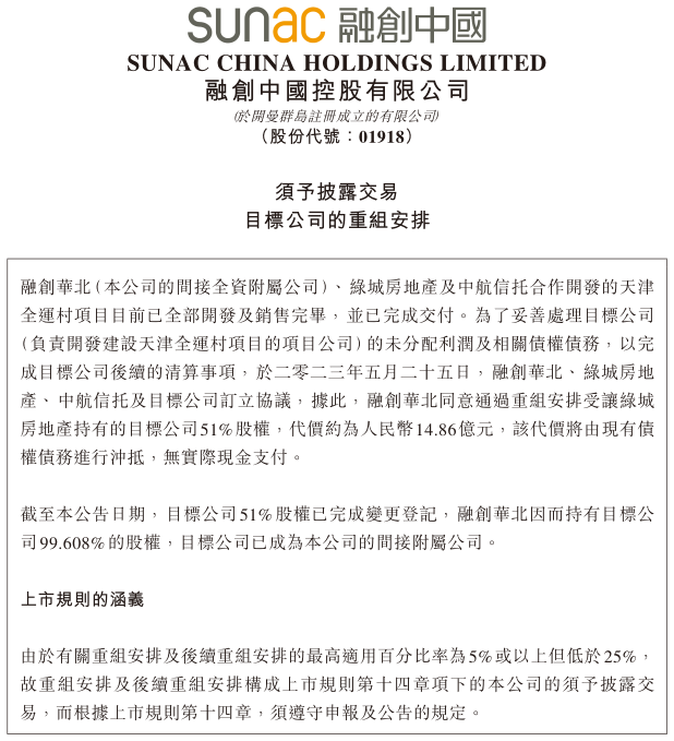 根據重組協議,綠城房地產將總代價中約14.35億元的應收款轉讓給項目公司,從而與綠城房地產應付項目公司的等額往來欠款相沖抵,該代價衝抵安排於目標公司51%股權登記變更至融創華北之日視為完成。