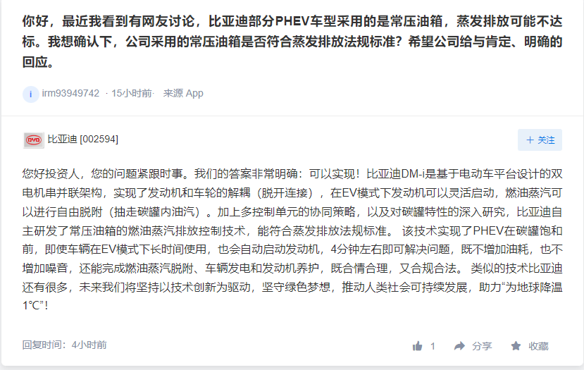 此外,部分投資人比較關心比亞迪在海外和國內是否採用不同的油箱方案。比亞迪對此也做出了回應,表示:“國內和國外都一樣,常壓油箱和高壓油箱都有采用,都符合當地排放法規標準。”