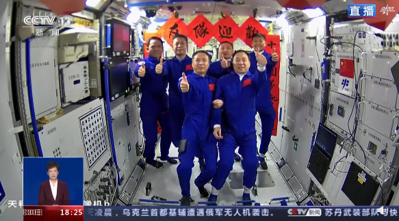 神十五神十六乘組太空會師,拍下“全家福”(視頻截圖)