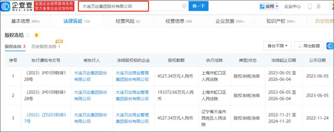 企查查網站顯示,近日,大連萬達集團股份有限公司所持有的大連萬達商業管理集團股份有限公司19.79億元股權被凍結,執行法院為上海市虹口區人民法院。