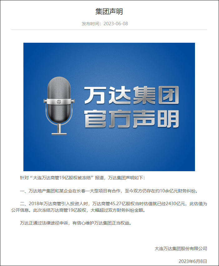 針對“大連萬達商管19億股權被凍結”報道,萬達集團官網6月8日發佈《集團聲明》。