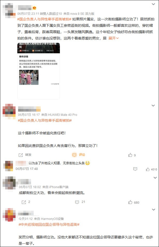 上述視頻引發網友熱議,有網友表示,攝影師立功,“沒他,大家都還不知道這位國企領導的秘密要藏多久”“以為去了外地沒人知道,無奈街拍上頭條”。
