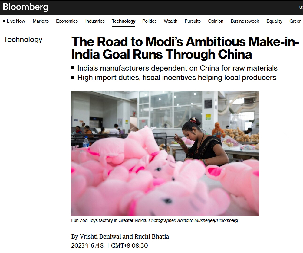 “莫迪雄心勃勃的‘印度製造’目標,要通過中國實現”,美國彭博社8日報道以此為題,從一家印度知名本土玩具商的困境切入,描繪了其背後整個印度製造業要追趕中國的挑戰所在。報道稱,儘管莫迪政府為當地產業提供了眾多補貼激勵,但印度製造商仍十分依賴來自中國的原材料。