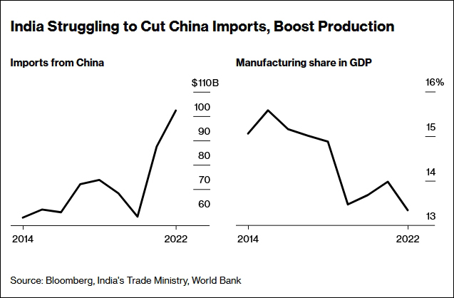 2014年至2022年,印度從中國進口額(左)和製造業在印度GDP中份額的變化。圖片來源:彭博社
