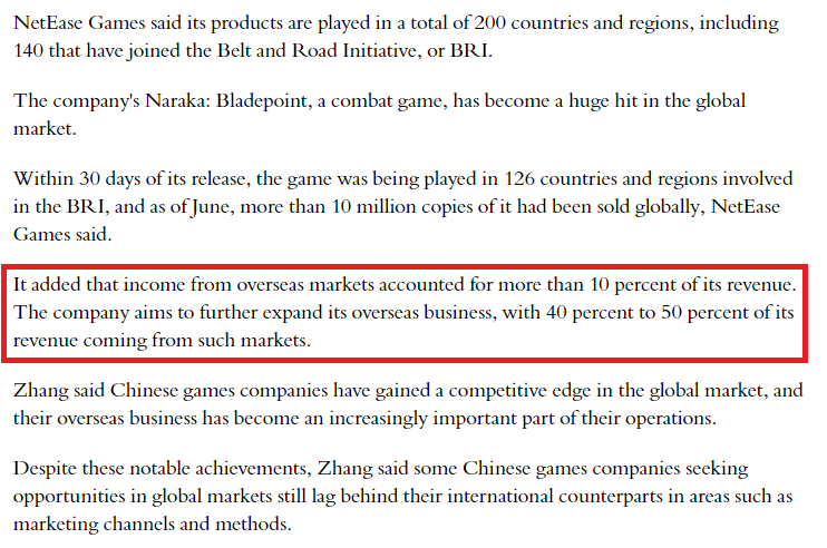 據《中國日報》今年5月報道,網易遊戲計劃未來海外市場將貢獻40-50%的收入,但目前其貢獻率大約在10%以上。據財報,2022年網易遊戲及相關增值服務淨收入為745.67億元。網易遊戲海外收入和騰訊不在一個量級。