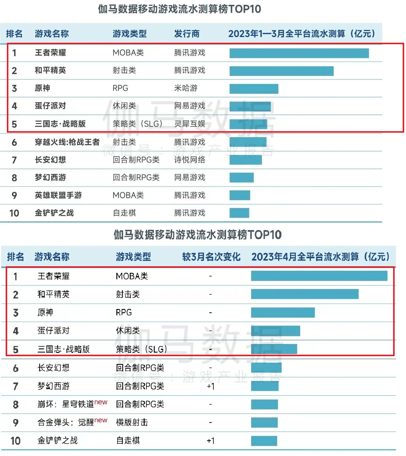 根據伽馬數據統計,今年Q1到4月份,全平台手遊流水TOP5的位次基本沒有變化。騰訊牢牢佔據頭2席,米哈遊、網易,阿里旗下的靈犀互娛位列其後。