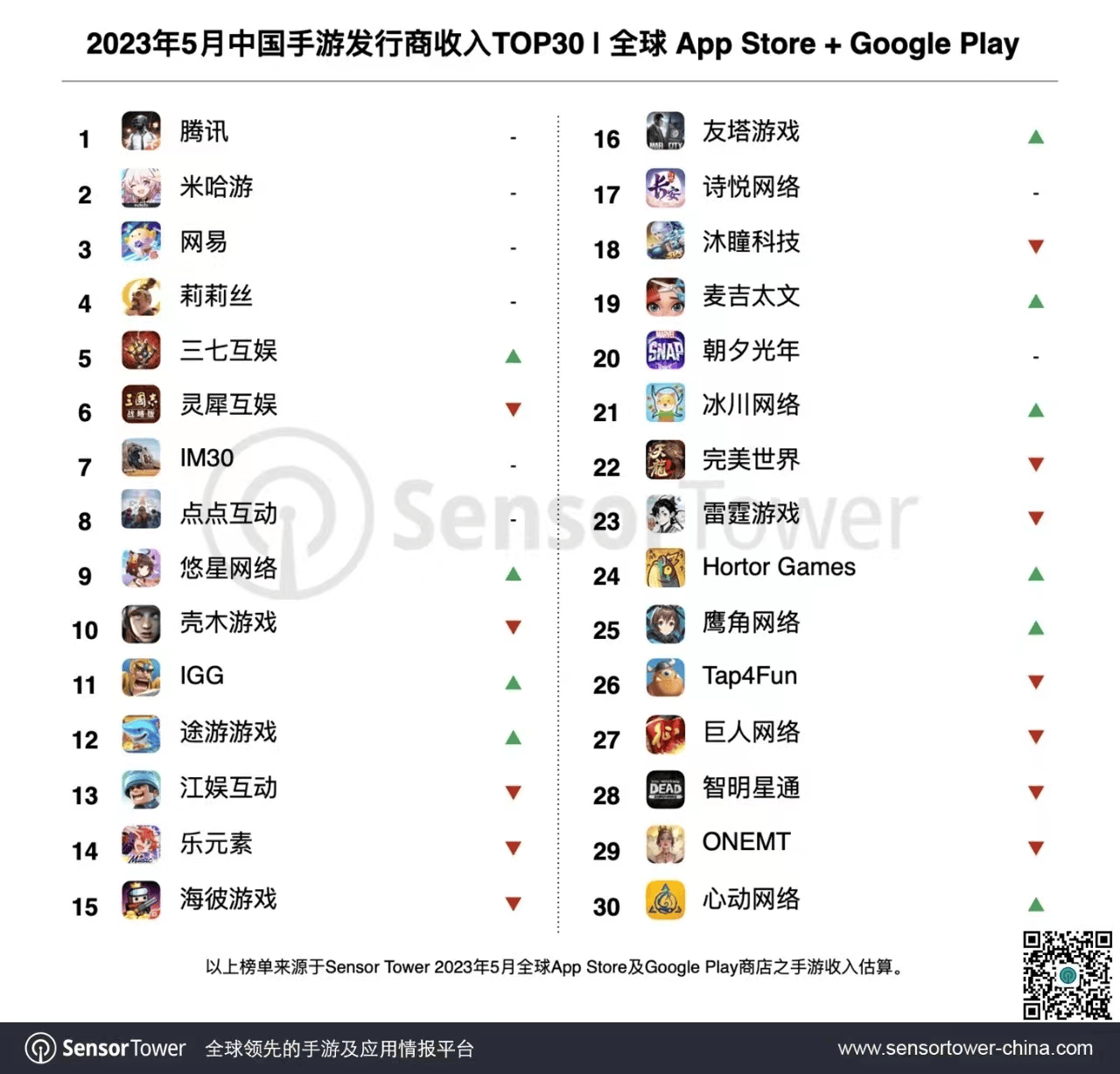 報告稱,《星鐵》和《原神》分列5月全球手遊暢銷榜第2和第7名。這幫助米哈遊收入環比激增41%,創歷史新高,“標誌着米哈遊從遊戲設計到用户圈層全方位成功破圈。”