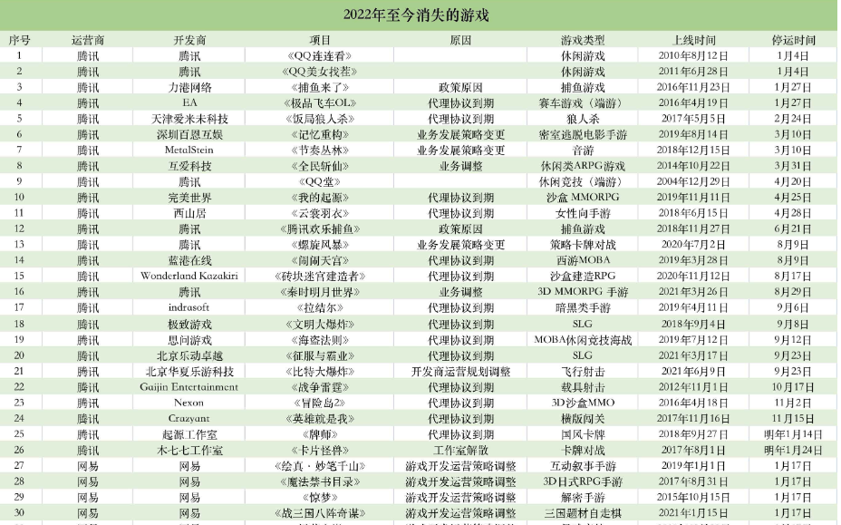 據時代財經統計,2022年年初至12月,國內至少有75款遊戲項目宣佈解散或停運。在各大廠商之中,騰訊停運項目數量最多(26個),其次是網易(14個)、B站(10個)以及朝夕光年(4個)。其中不乏《QQ堂》等具備較長曆史,以及《秦時明月世界》等擁有一定知名度的作品。