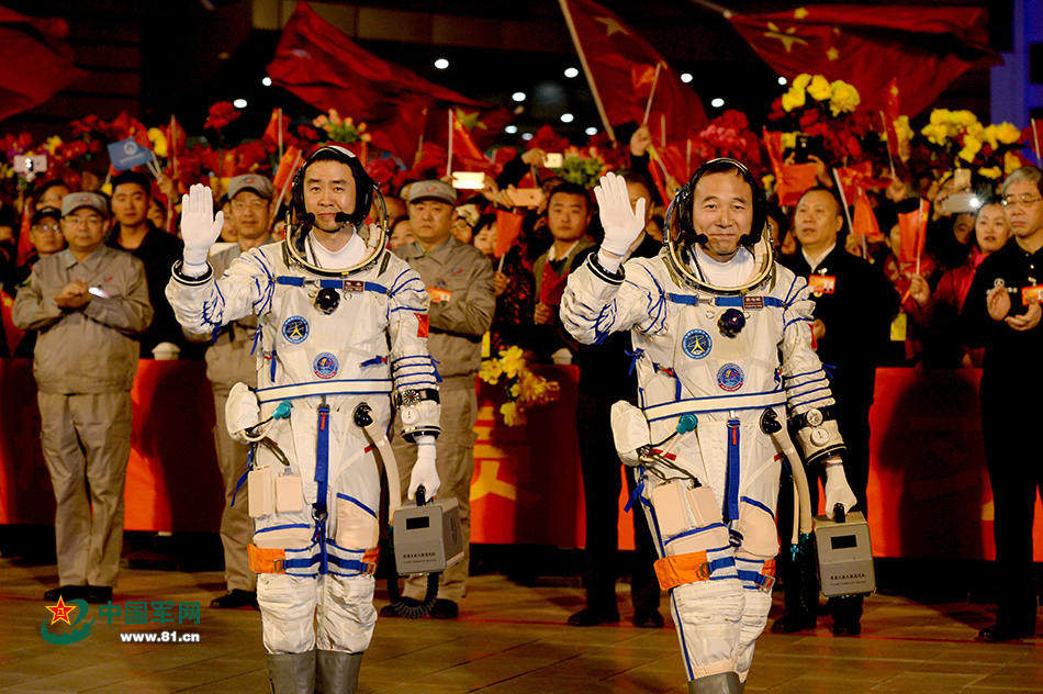 航天員陳冬(左)與景海鵬(右)在神舟十一號載人飛行任務出征儀式上揮手 圖自中國軍網