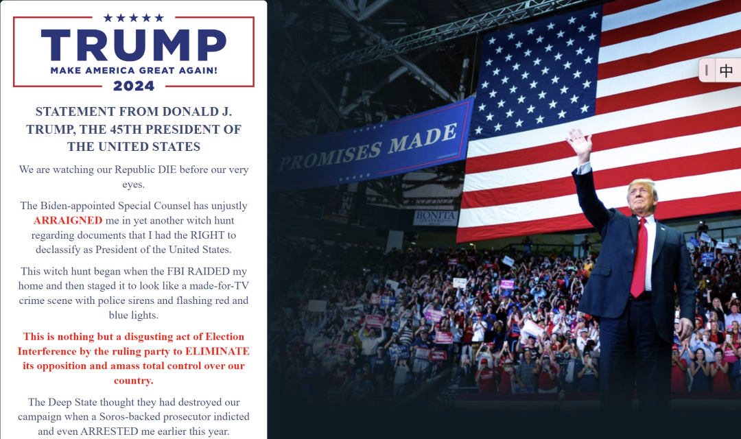 特朗普官方競選網站廣告已更新為對第二次被檢控的指控(6月14日截圖)