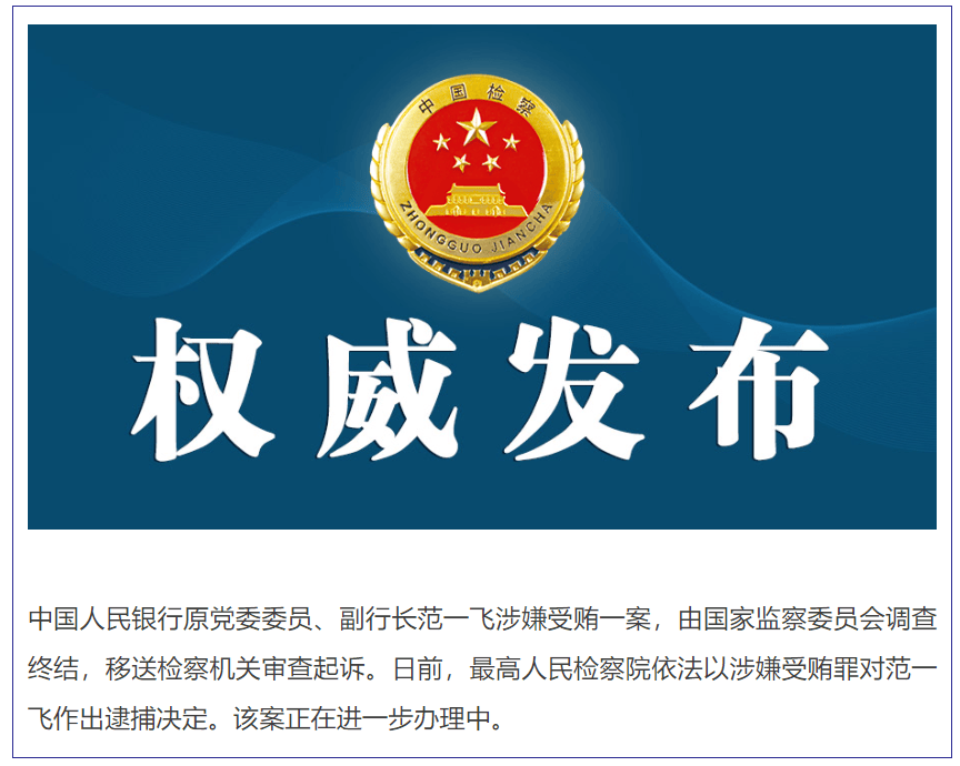 最高人民檢察院依法對央行原副行長範一飛決定逮捕