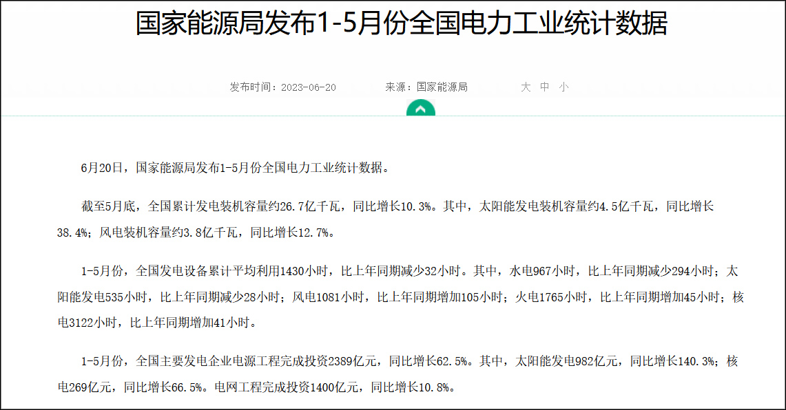 6月20日,國家能源局發佈1-5月份全國電力工業統計數據。