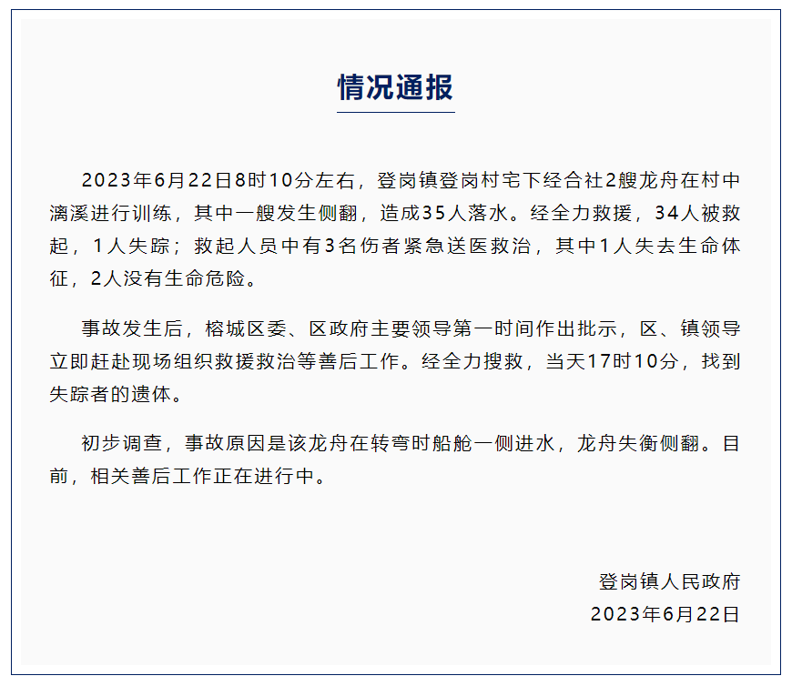 事故發生後,榕城區委、區政府主要領導第一時間作出批示,區、鎮領導立即趕赴現場組織救援救治等善後工作。經全力搜救,當天17時10分,找到失蹤者的遺體。