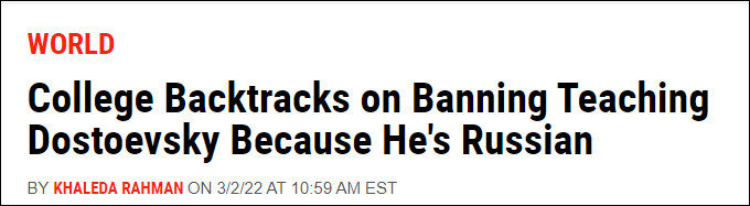 蘇聯1979年入侵阿富汗後,雖然美國拒絕向1980年舉行的莫斯科奧運會派遣運動員,但鮑里斯·帕斯捷爾納克與亞歷山大·索爾仁尼琴等蘇聯作家依然被當時的美國社會視作“良心的聲音”且受到歡迎。很難想象任何當代俄羅斯作家或文化界人士如今能在美國得到類似的禮遇。在有些地方,連亞歷山大·普希金、托爾斯泰與陀思妥耶夫斯基等俄羅斯古典文學成就的核心代表都被蒙上了懷疑的陰雲。一些文化機構不再將這些知名人物視作俄羅斯對西方文化做出貢獻的榜樣,而是當做一份俄羅斯永恆帝國主義的文化標本,或者是為普京主義披上光鮮外衣的作家,其影響是令這些俄羅斯作家不再是“歐洲人”或者“西方人”,而是愈發成為“外國人”。
