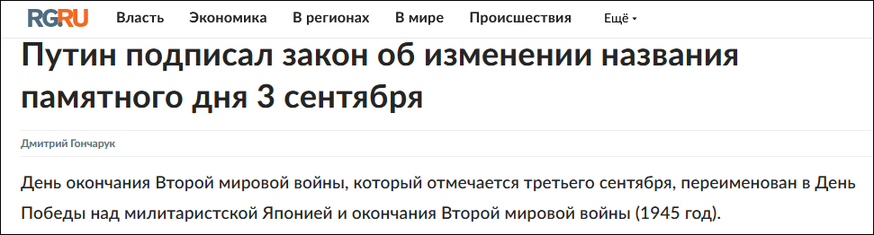 俄羅斯衞星通訊社稱,法律解釋性文件中指出,俄羅斯開展特別軍事行動後,日本方面與西方聯合發起俄日歷史上史無前例的不友好行動。9月3日紀念日名稱的改動是“反制措施”之一。