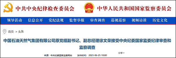 據中央紀委國家監委網站6月25日消息,中國石油天然氣集團有限公司原黨組副書記、副總經理徐文榮涉嫌嚴重違紀違法,目前正接受中央紀委國家監委紀律審查和監察調查。