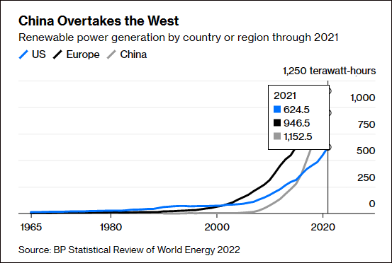 中國可再生能源發電量超過歐洲,大幅領先於美國,彭博社製圖