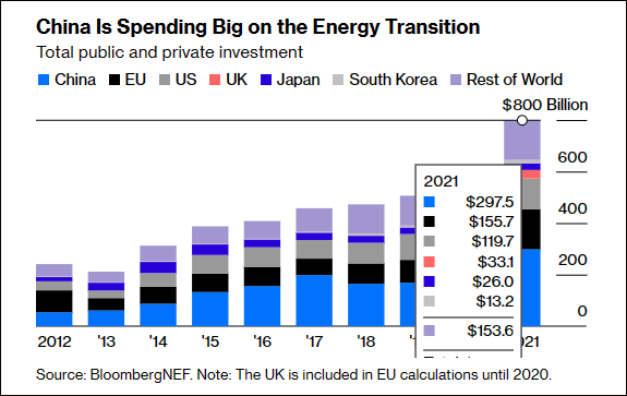 文章援引數據指出,目前,中國風力發電量為650太瓦時,幾乎是美國的兩倍;中國的太陽能發電量佔全球的三分之一,達到330太瓦時,是美國的兩倍多;中國政府正在建設的可再生能源設施遠遠超過其他任何國家,預計2025年可再生能源設施將佔電網的三分之一;中國2022年投資5460億美元加速向可再生能源轉型,投資額為歐盟的三倍、美國的四倍……
