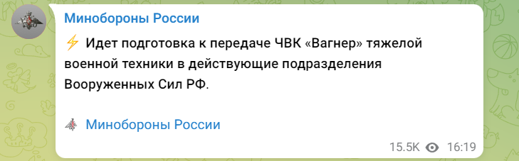 俄國防部:瓦格納集團準備移交重型軍事裝備 None 2023-06-27 (觀察者網訊)當地時間6月27日,俄羅斯國防部通過其電報頻道發表聲明稱,將瓦格納僱傭兵組織的重型軍事裝備轉移到俄羅斯武裝力量現役部隊的準備工作正在進行中。 俄羅斯國防部聲明截圖