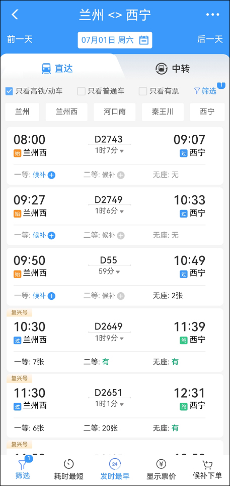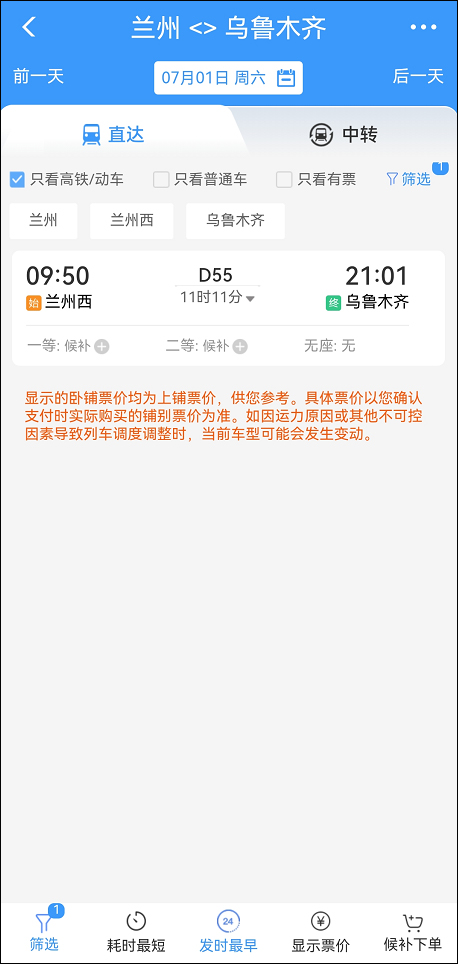 12306 APP顯示,旅客可以購買7月1日起從蘭州開往烏魯木齊的車票。