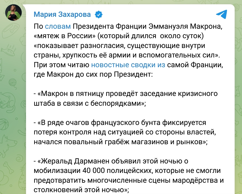扎哈羅娃在Telegram上寫道:“法國總統馬克龍認為,‘俄羅斯的叛亂’(大約持續一天)‘顯示了國家內部存在的分歧,以及其軍隊和輔助部隊的脆弱性’。與此同時,我也讀到了來自馬克龍總統領導下的法國的新聞報道。”