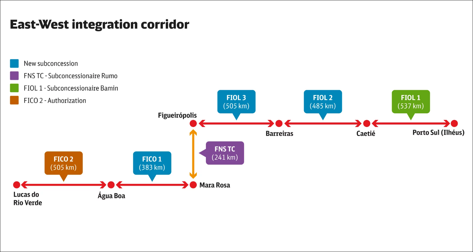 其中FICO線由“南北鐵路”線上的馬拉羅薩出發向西延伸,FIOL線自菲蓋羅波利斯向東延伸至伊列烏斯的海港。FIOL線路分成三段,其中第一段從伊列烏斯到卡埃蒂特,全長537公里。