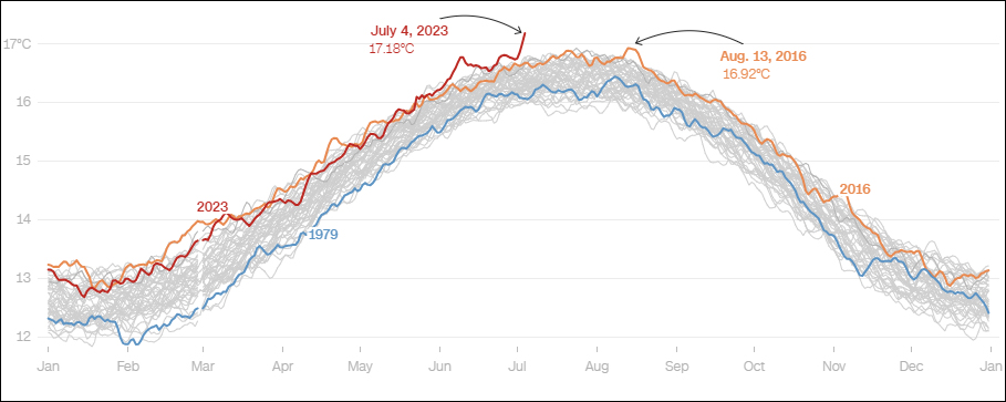 1979年至2023年7月4日世界每日平均氣温。圖自CNN