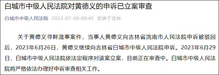 據微信公眾號“白城市中級人民法院”7月8日消息,關於黃德義尋釁滋事案件,當事人黃德義向吉林省洮南市人民法院申訴被駁回後,2023年6月26日,黃德義繼續向吉林省白城市中級人民法院申訴。2023年6月29日,白城市中級人民法院依法定程序對該案立案,目前正在審查中。白城市中級人民法院將嚴格依法辦理好申訴審查相關工作。