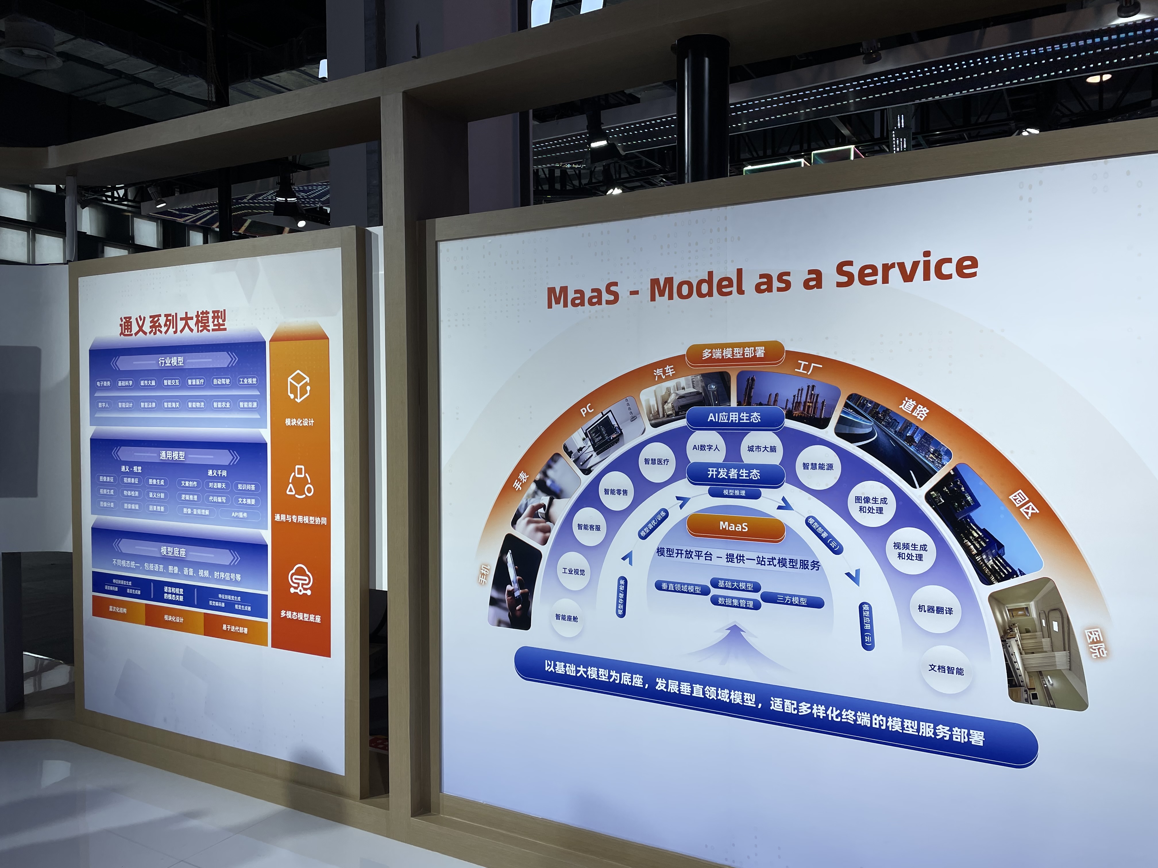 作為“模型即服務”的倡導者,阿里雲展出的通義大模型允許企業微調、訓練模型,打造模型開放平台,提供一站式模型服務。阿里雲還展示了其雲計算技術體系的三層架構,從下到上分別包括基礎設施即服務(IaaS)、平台即服務(PaaS)和模型即服務(MaaS)。