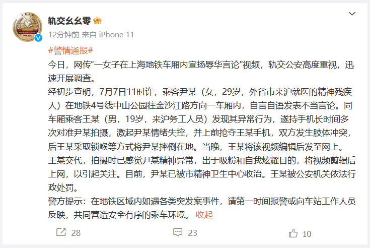 7月8日,上海市公安局城市軌道和公交總隊官方微博(軌交幺幺零)發佈警情通報:
